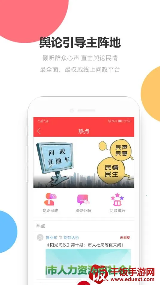 3. 政民互动新方式,线上问政平台方便用户随时选择问政机构,通过网络高速问政,实现高效的政民互动,促进政务透明与沟通。