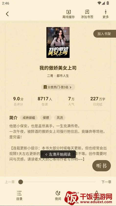 4. 功能贴心实用:设有书架管理功能,可方便添加喜欢的小说;提供书籍搜索和分类功能,快速定位目标作品;内置章节跳转和书签功能,便于记录追踪阅读进度。