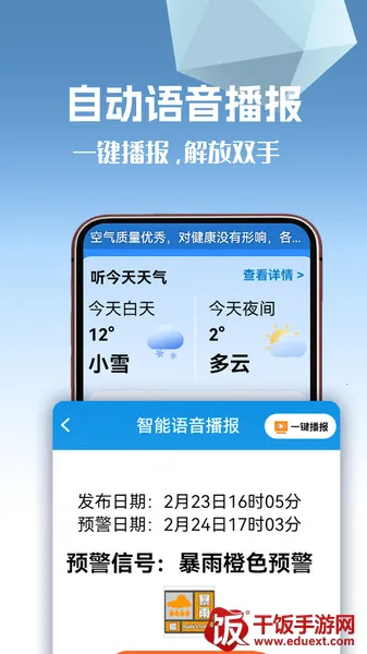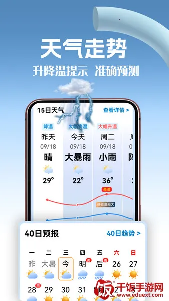 4、便捷实用:操作简单,下载开启授权即可使用;首页推送城市广泛,可一键查询各地天气;支持详细天气查询,提供未来四十天天气获取;当天天气突变会及时提醒,图表还能放大查看细节。