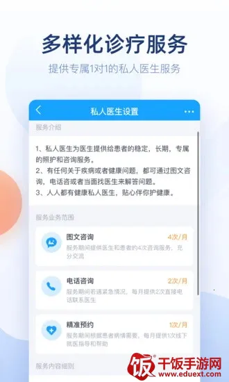 1. 专属线上诊间:随时随地为患者解答咨询,提供多样化诊疗服务,还有专属1对1私人医生服务。