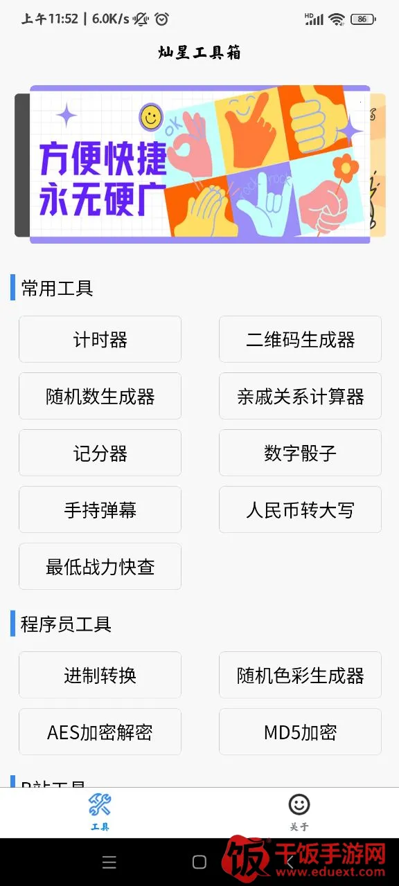 灿星工具箱是功能强大的工具箱应用,集多种小工具于一身,涵盖常用、娱乐生活、极客、系统程序等类别。功能齐全免费,操作方便,界面简洁分类详细,不断更新,满足多场景需求,适合各人群。