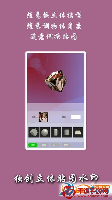 3. 独特水印效果:拥有独创的2D、3D字体纹理水印以及3D字体水印,还能给字体加上喜欢的贴图,让水印脱颖而出,制作出高端大气漂亮的立体字体水印。