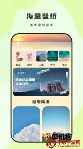 1、分类丰富又实用。首页分类栏涵盖鲜花、动物、山水、天空、海洋等主题,壁纸精选界面能自由选清新人物或花卉壁纸,精选动态壁纸分类还有自然风景、宇宙星辰等动态壁纸,助您快速定位喜好,轻松打造个性桌面。