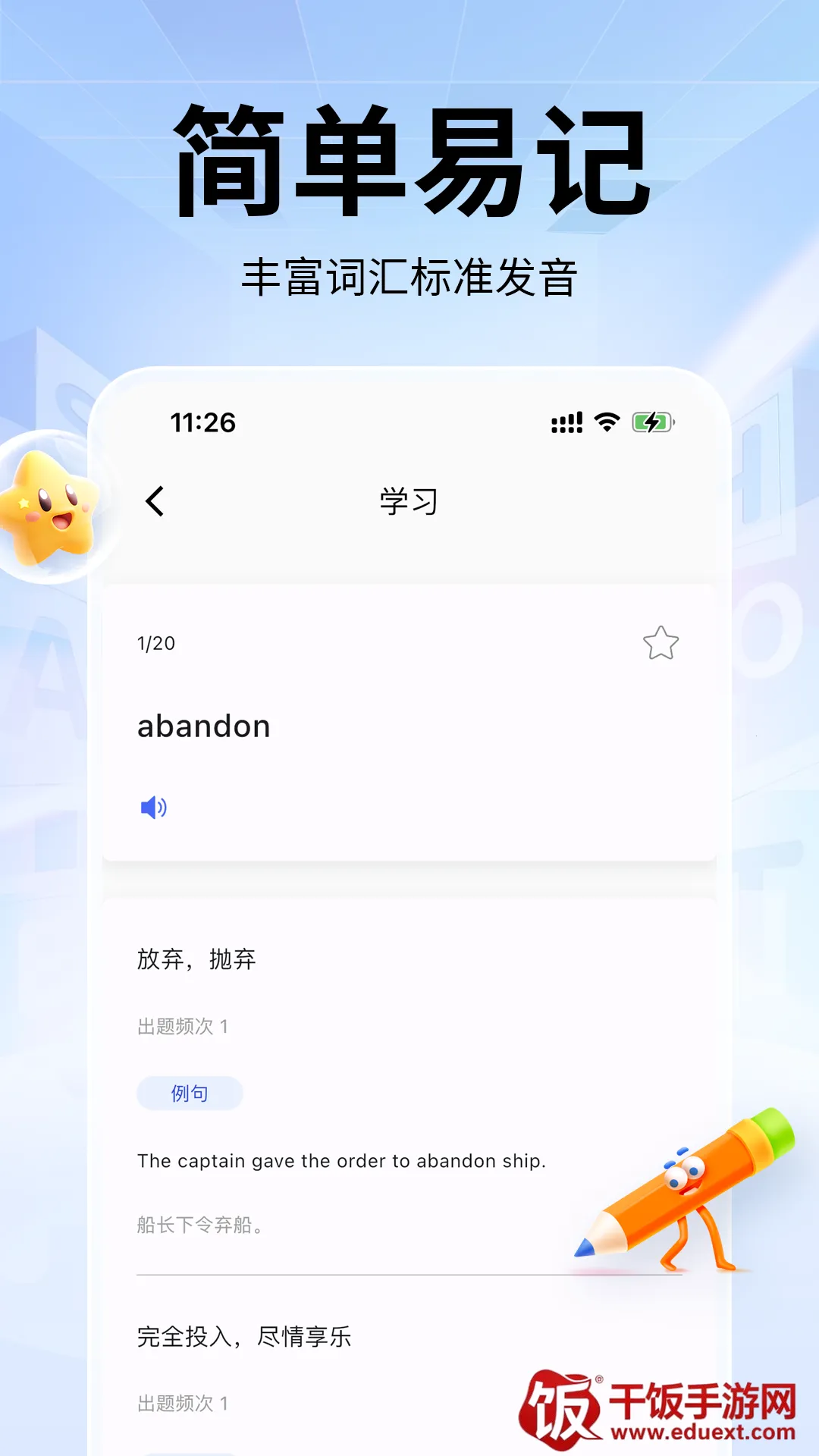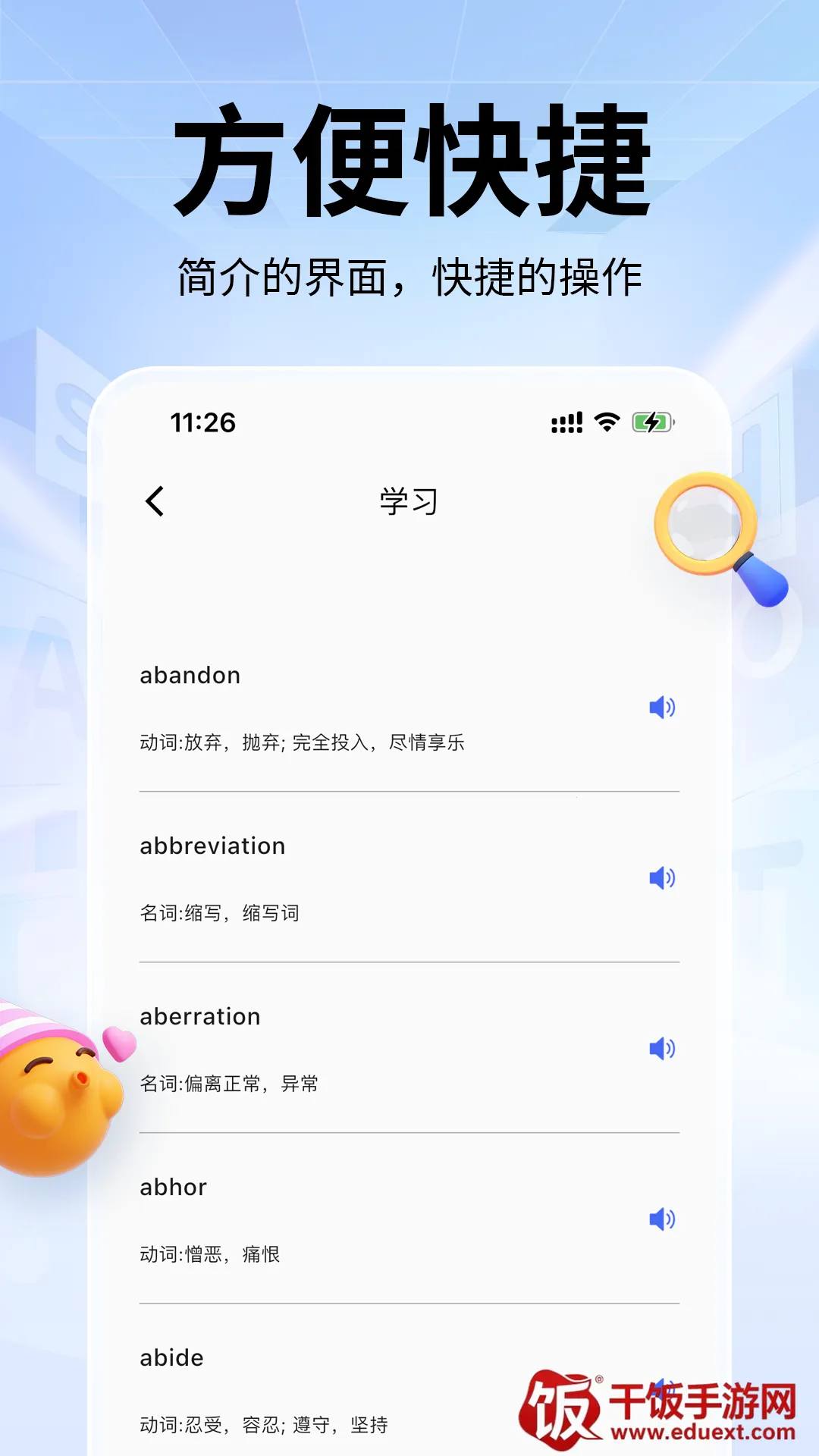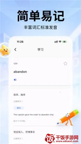 单词斩是一款出色的英语背单词软件。它按使用场景智能分类单词,每个单词配有影视原声例句和记忆漫画,助你快速掌握。能依做题速度自动调整复习频率,搭配智能计划。其核心特色更是突出:图文联想记忆,每个单词配趣味插图和情境例句,建立形象联系,提升记忆效率;智能复习系统,依据艾宾浩斯遗忘曲线精准推送复习单词,巩固长期记忆;个性化词库,涵盖主流考试词库,可自由选择学习目标;即时测试反馈,学后即时测试,准确评估掌握程度,薄弱单词自动标记加强训练。
