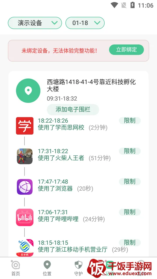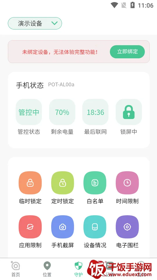 2、点击守护,绑定孩子设备后就能畅享各种管控功能,尽在掌握。