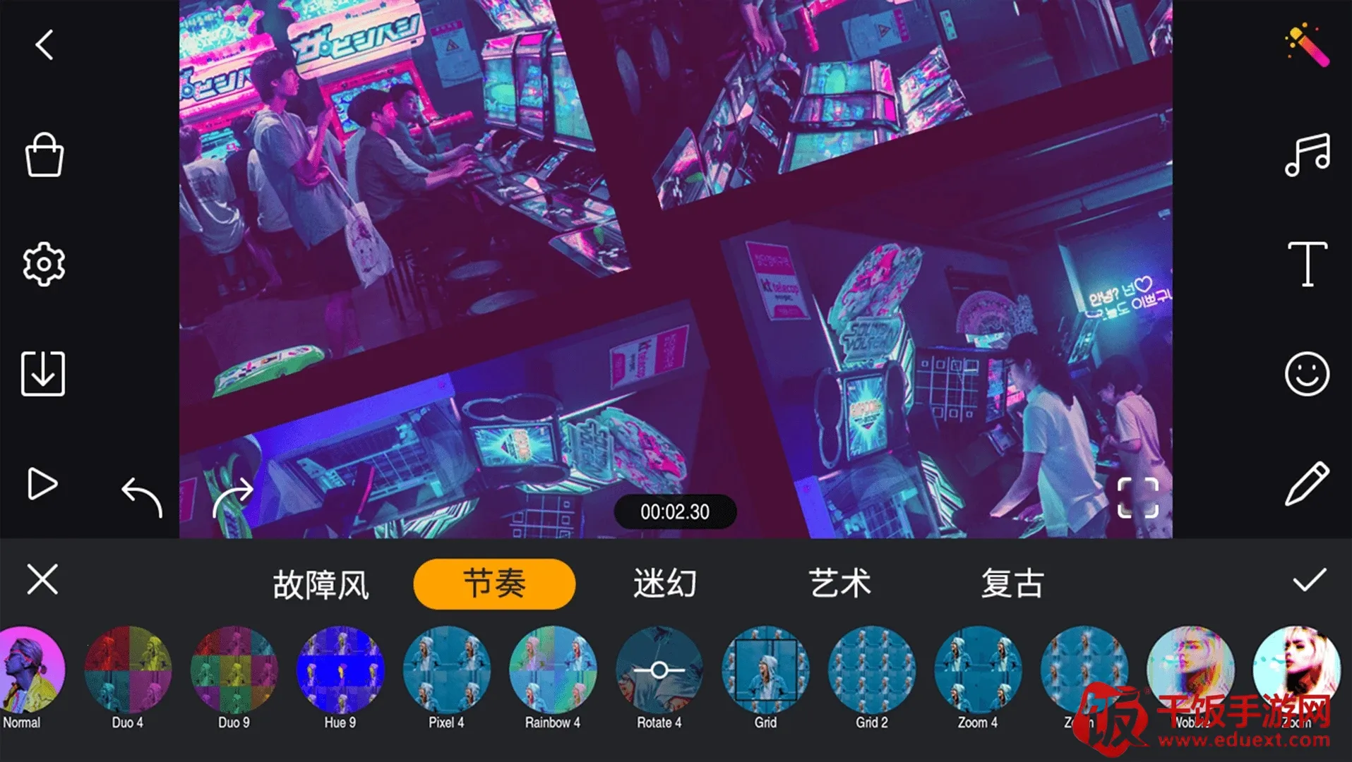 2. 素材丰富:提供海量滤镜、特效、音乐背景等素材,依视频主题选合适内容,让视频更高级。