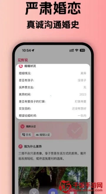 荒野说离异平台 2026 官方最新版本核心特色显著。它是专注高质量再婚的严肃交友 APP,通过实名与婚史双重认证杜绝虚假。所有用户均实名认证,信息完整。这里是离异再婚人士专属平台,学历房产车辆婚姻等多重认证构建高品质相亲环境。实名制注册,打造绿色健康相亲氛围。用户能发布动态展示自己,还有专业红娘在线牵线,提升相亲机率。在这能专注与心仪对象深度交流,让脱单更简单,全新互动交友形式,视频交友等带来别样体验。