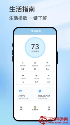 2.在生活指南页面,展示了空气质量参数信息,秒速对比,还有节气和历史事件查询功能。