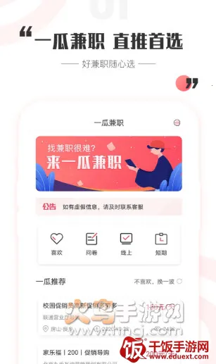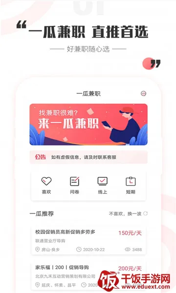 一瓜兼职 2025 最新版本是上海燃聚网络科技有限公司旗下的网上找兼职软件。提供丰富兼职岗位,涵盖多行业,收益透明当天结算,有多种赚钱方式,企业严选保障工资安全,操作便捷,助用户轻松兼职赚钱。