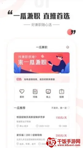 一瓜兼职为用户提供了丰富多样的兼职选择,涵盖多种行业领域。它具有诸多优势,比如企业严选,兼职信息真实可靠,经过严格审核才发布,保障了用户兼职工资安全,不用担心被无良商家克扣。而且能智能推送人气兼职工作,用户可快速找到喜欢的,招聘兼职信息实时发布,找兼职效率更高。工资结算透明,当天立即结算,收益无延迟发放情况。还支持多种结算方式,确保用户能收到兼职工资。其操作也较为简便,下载安装后登录,就能轻松开启兼职之旅,填写简历、在线投简历等流程都不复杂。无论是学生、居家宝妈还是上班族,都能利用空闲时间在这里轻松找到适合自己的兼职,赚取生活费,让生活有更多可能。