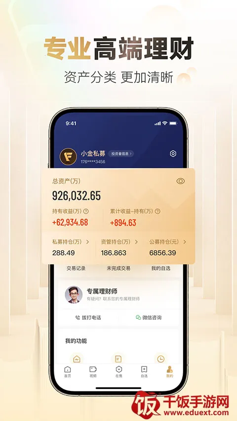 1. 一站式资产配置:为高净值用户提供从投前到投后的全方位服务,投前可查净值、找产品、看路演、与大咖交流,投中线上电子签约、交易方便快捷,投后资产实时更新、订单详情便于查看。