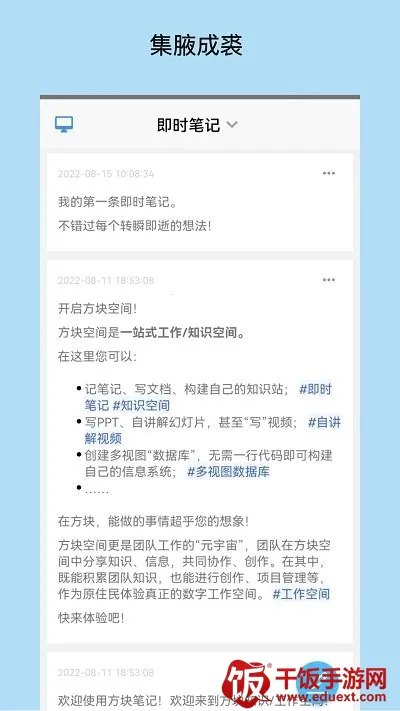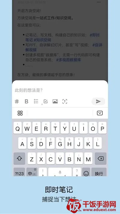 方块致知灵感笔记是一款办公学习适用的记事本软件,能便捷记录会议、工作重点等。有即时笔记等功能,笔记标签自动分类,UI 设计直观,还有智能化推荐,可帮用户打造一站式工作学习空间。