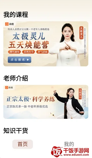 1、打开太极讲堂app,进入软件首页,可查看我的课程老师介绍等
