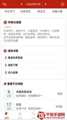 观吾道历核心特色鲜明。它将传统道家文化与现代数字生活深度融合,由专家联合审校内容,确保准确严谨。独创道历、公历、农历三历同显界面,时间维度清晰对照,兼顾传统与现代。引入今日修心模块,推送道家箴言并白话解读,滋养精神。采用低饱和度水墨风UI设计,静谧雅致无广告,营造良好氛围。还支持自定义提醒,内置流年运势简析,提供节气食谱推荐,全方位满足用户需求,让传统文化完美融入现代生活。