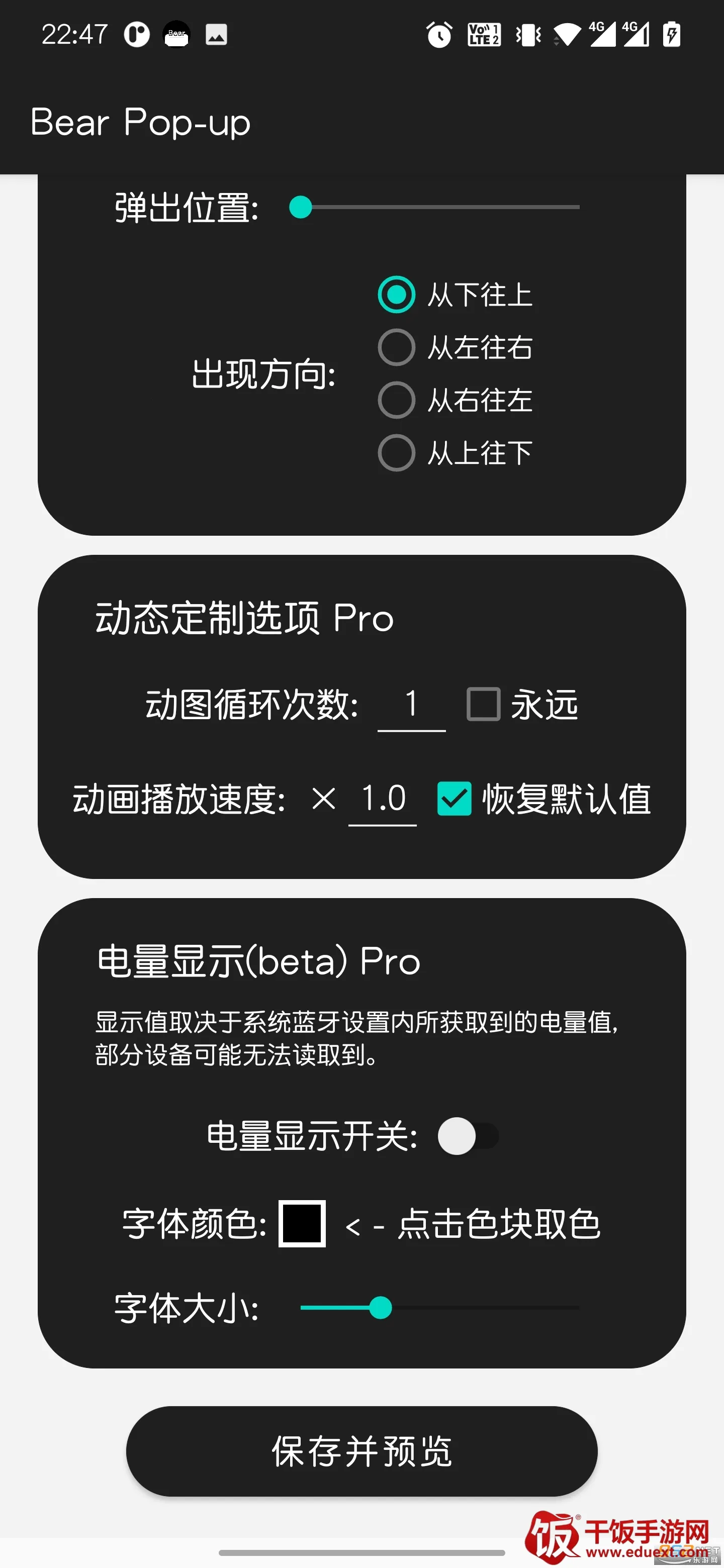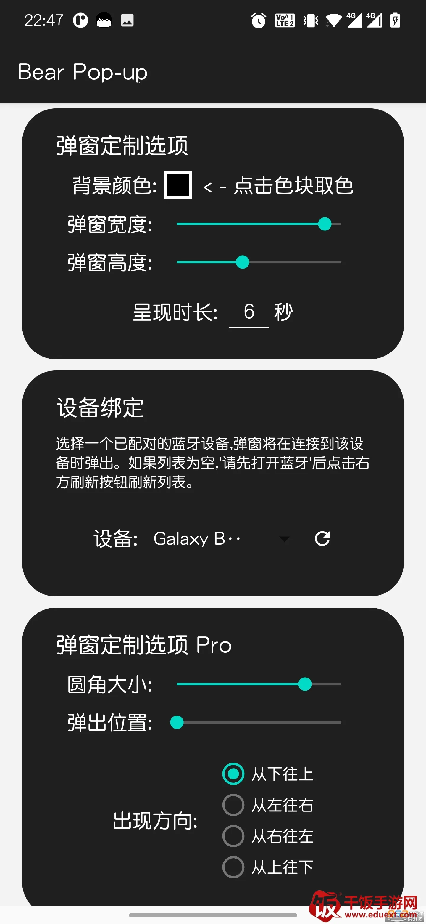 除了上方的弹窗文字内容及图片,Bear Pop-up还提供了丰富的可自定义选项,包括弹窗背景色、文字颜色(上左右文字颜色、*电量显示文字颜色)、弹窗尺寸(显示长宽)、弹窗呈现时长、左右侧按钮应用跳转、*圆角大小、*弹窗样式(方向)、*动画循环次数及*电量显示开关 。带'*'属性为登录授权用户可定制属性。