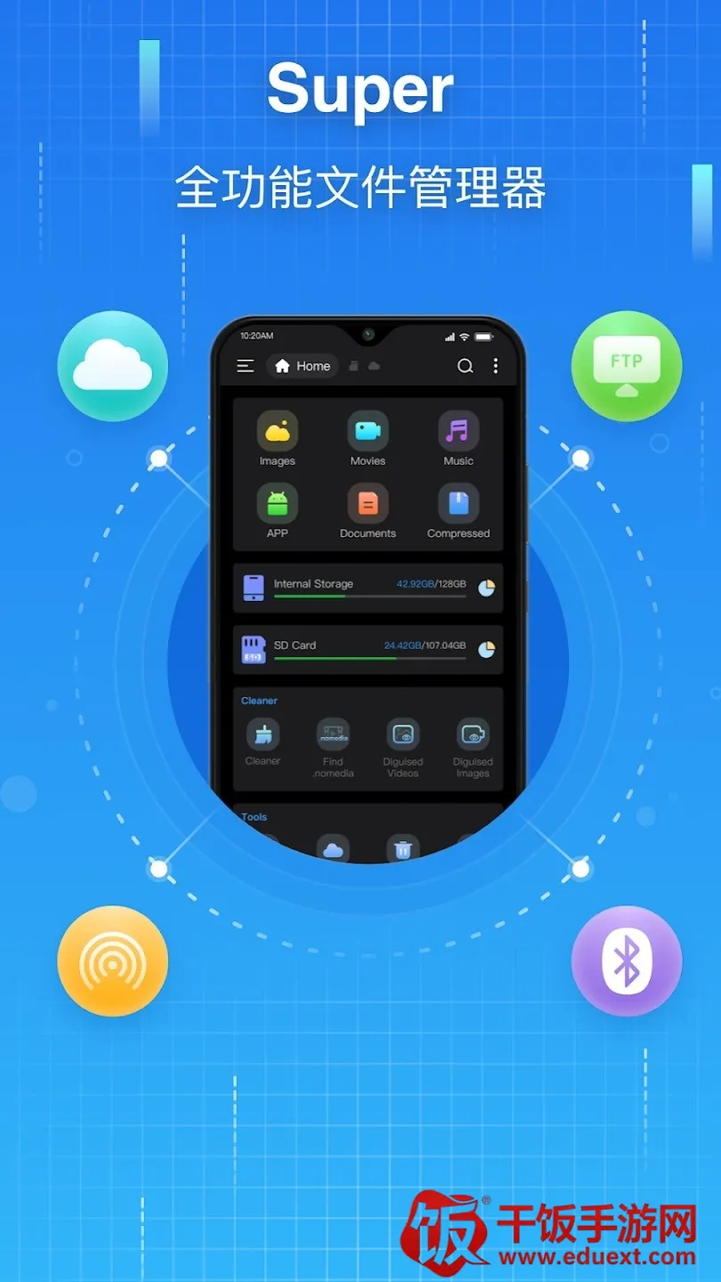 Super文件管理器2026可查看手机内部存储、SD卡及USB OTG设备文件,能清理大文件和重复文件,自动归类图片等,支持批量操作,还接入主流网盘,有多种文件管理及应用管理功能,操作简单。