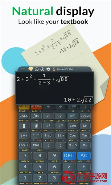 2、显示直观:采用2行自然教科书显示,能呈现分数、公式、平方根等表达式,如同教科书一般,增强结果理解力。