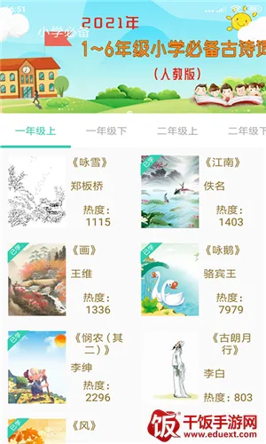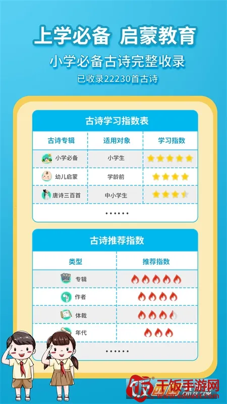 1. 海量诗词资源丰富:汇总超20000首古诗词,涵盖唐诗三百首、小学1到6年级必备古诗、幼儿启蒙等专辑,包含五言古诗、七言古诗、五言律诗、乐府诗、楚辞、散曲、文言文等各类体裁,还有与中华民族传统重大节日、二十四节气相关的古诗专辑。