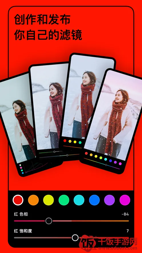 3、操作方式多样:对于参数调整,提供常规和备选两种控制方式。常规用手指滑动控制,许多修图工具都如此;备选是使用陀螺仪控制参数,长按色块,左倾或右倾手机改变数值。