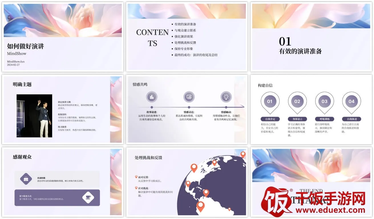 1. 智能匹配,风格多样:每一页自动匹配字体大小、图文比例、背景色调,内置多种主题模板,风格丰富不撞款。