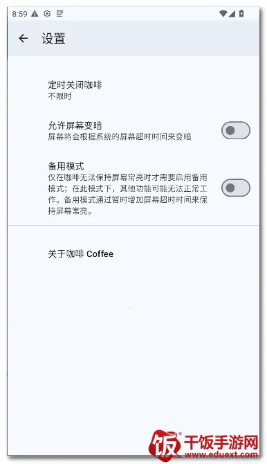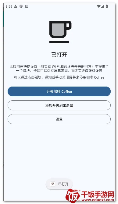 咖啡Coffee安卓应用能让屏幕常亮,无需改设备设置。可在快速设置板块、应用内按钮等位置切换功能,需Android7或更高版本,还能设置为辅助应用等,可能因电池保护模式故障,可启用备用模式。