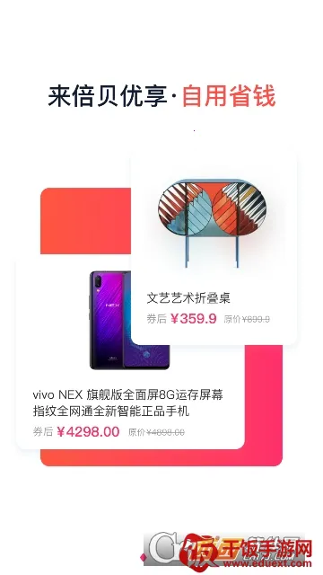 倍贝优享是一款超棒的手机购物软件。它能帮你解决购物难题,带来诸多便利。这里商品种类丰富,设置了不同类别,能让你快速体验多样商品内容。你可以直接搜索所需商品下单,轻松找到所有想要的产品。软件还能随时提供商品,让你在家就能轻松快速地在线购买,还有送货上门服务。遇到购物问题,能向客服咨询,享受最佳购物服务。它更是个省钱神器,汇集各大商城隐藏优惠券,优惠幅度大,涵盖各种日常购物商品种类优惠券,85%以上网购商品都能找到券。支持一键搜索商品找券,每天精选优质好物9.9包邮限时特价抢购,还有购物达人直播分享帮你挑商品。自用省钱,还能零投资创业,有多项收入来源,是购物省钱的必备平台。