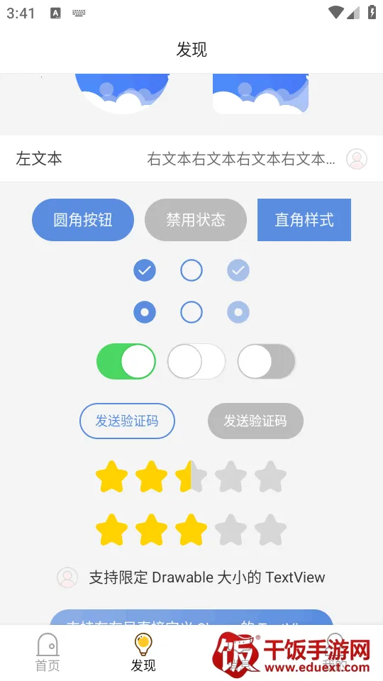 3、在发现页面有很多常用按钮效果。