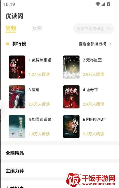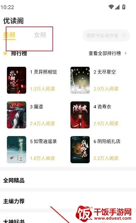 1、进入【书城】界面,可以查看男频,或者女频小说资源