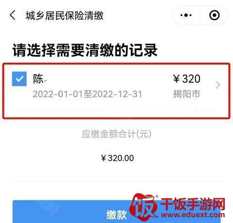 6、接着选择应征信息(原则上一个人只有一条应征数据,如果同一个人本年度出现两笔及以上应征数据,请先与各地医保经办机构核对修正,避免错误缴费),点击“缴款”进入“温馨提示”界面,请详细阅读提示内容