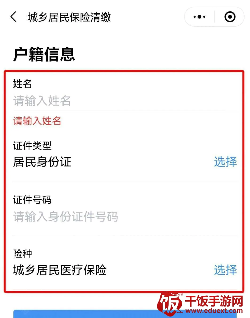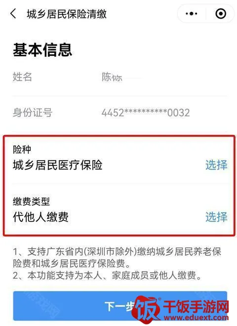 5、代他人缴费“险种”选择 “城乡居民医疗保险”,“缴费类型”选择“代他人缴费”,点击“下一步”进入“户籍信息”录入界面;