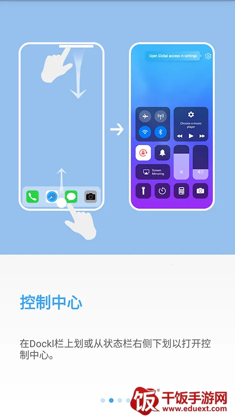 在dockl栏上划或从状态栏右侧下划以打开控制中心。