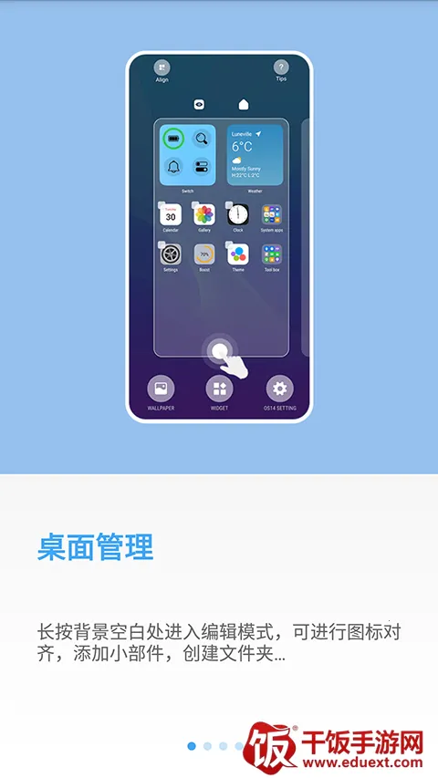 长按背景空白处进入编辑模拟,可进行图标对其,添加小部件,创建文件夹;