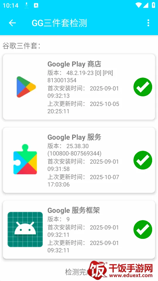 GG三件套检测是免费安全的谷歌套件检测工具,能快速检测手机上谷歌三件套是否安装、版本及更新时间,助您排查国际服游戏闪退等问题,还能查看依赖谷歌服务的app,它不提供下载安装服务。