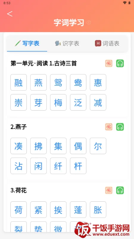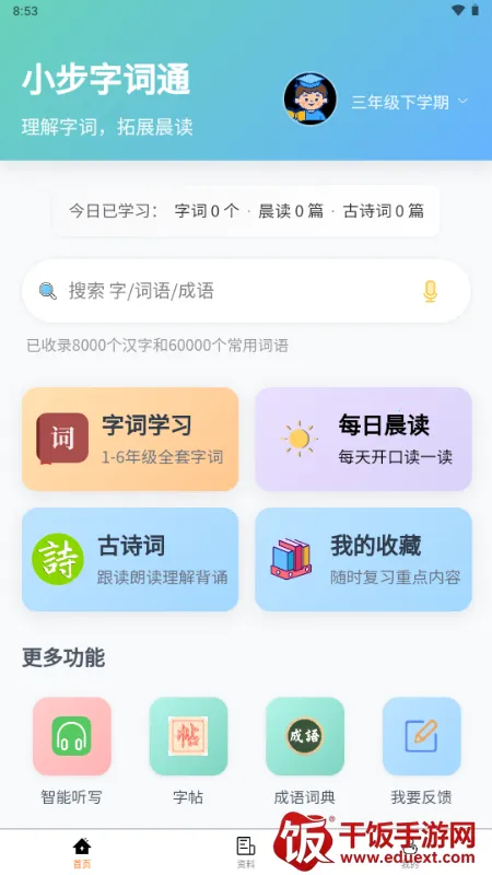 2. 海量资源:内置海量生字词资源,涵盖拼音、笔顺、组词、造句等多维讲解,方便随时查阅巩固。