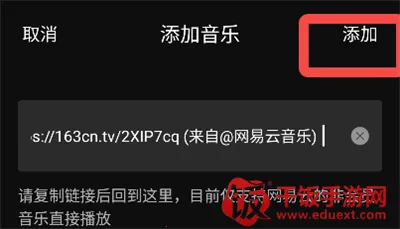 3、将想分享的歌曲链接粘贴到输入框(目前仅支持网易云的非会员音乐),点击右上角【添加】。