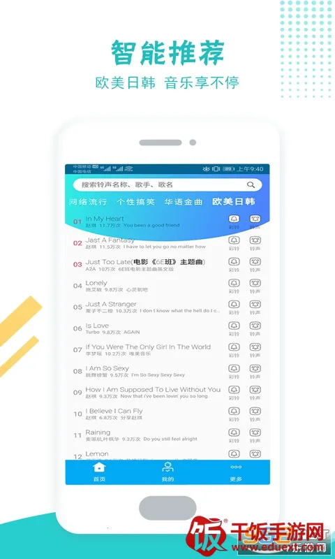 2. 铃声分类众多,涵盖网络流行、轻音乐、DJ、欧美日韩等多种类型,还有明星歌曲,方便按喜好查询。
