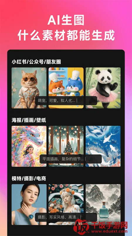 2. 功能强大:支持文生图、图生图、AI改图、AI超清、画面扩展等多种功能,还能实现平面转3D等。