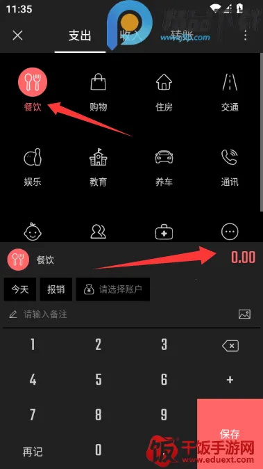 2、选择支出的类型和输入具体数额点击保存