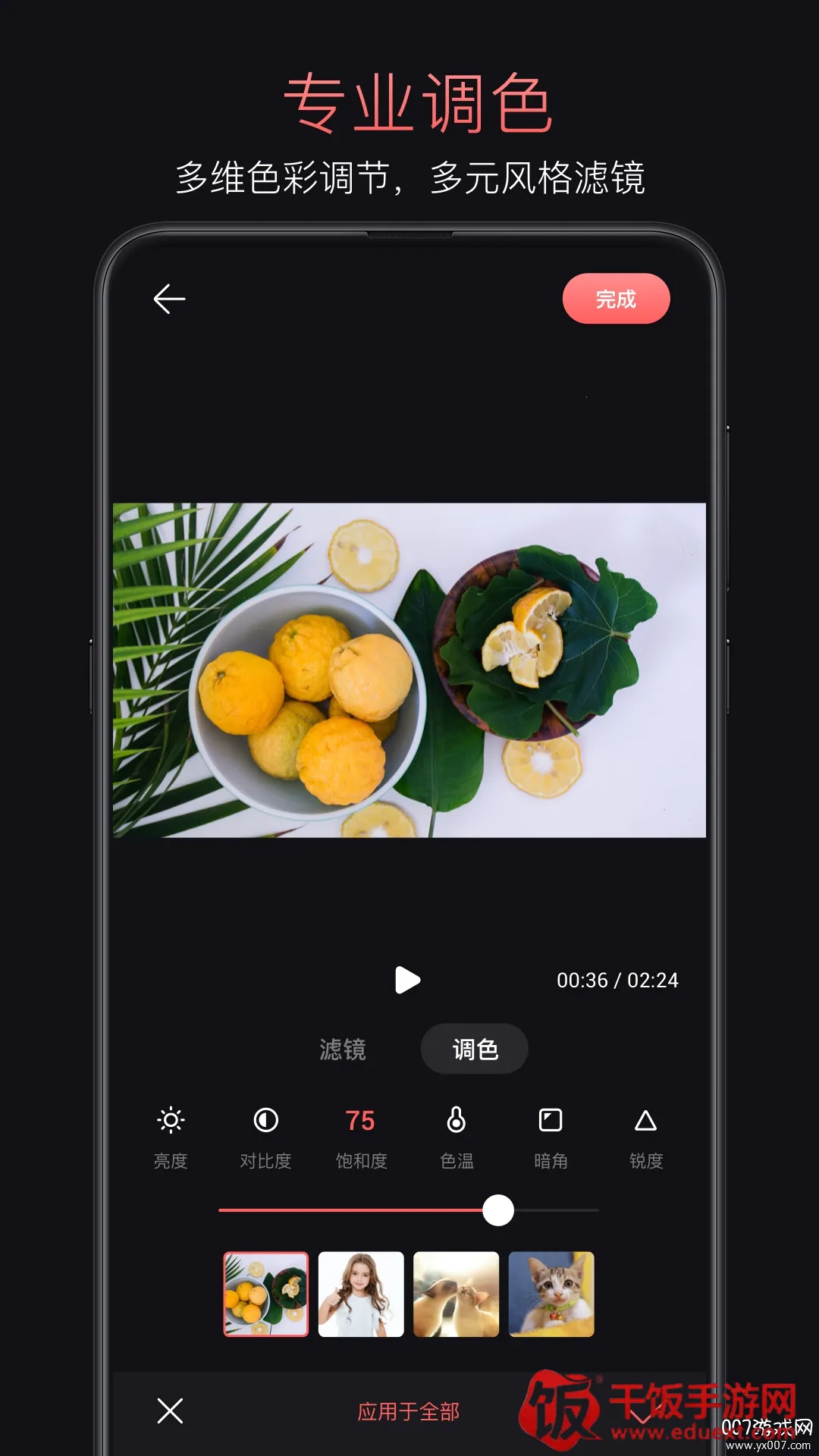 3、全能剪辑:全面的剪辑功能让创意尽情发挥。能轻松剪切合并视频、调整速度、倒放,还支持添加动态贴纸、艺术字幕、潮流音乐等。从视频调速到转场特效,从画幅比例切换到调色功能,各项功能强大且实用。