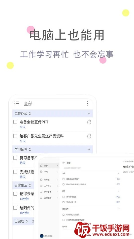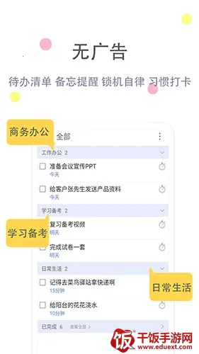 1、**高效工作**:待办事项清单助力更高效工作,避免因忙碌错过重要之事,从繁杂工作中解脱,提高效率拒绝加班。