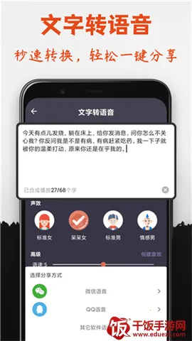 3、操作界面简单易用,即使是初学者也能轻松上手。支持一键分享给好友,传递变声乐趣,让更多人一同感受声音变化的魅力。变声结果真实自然,播放体验极具趣味性。