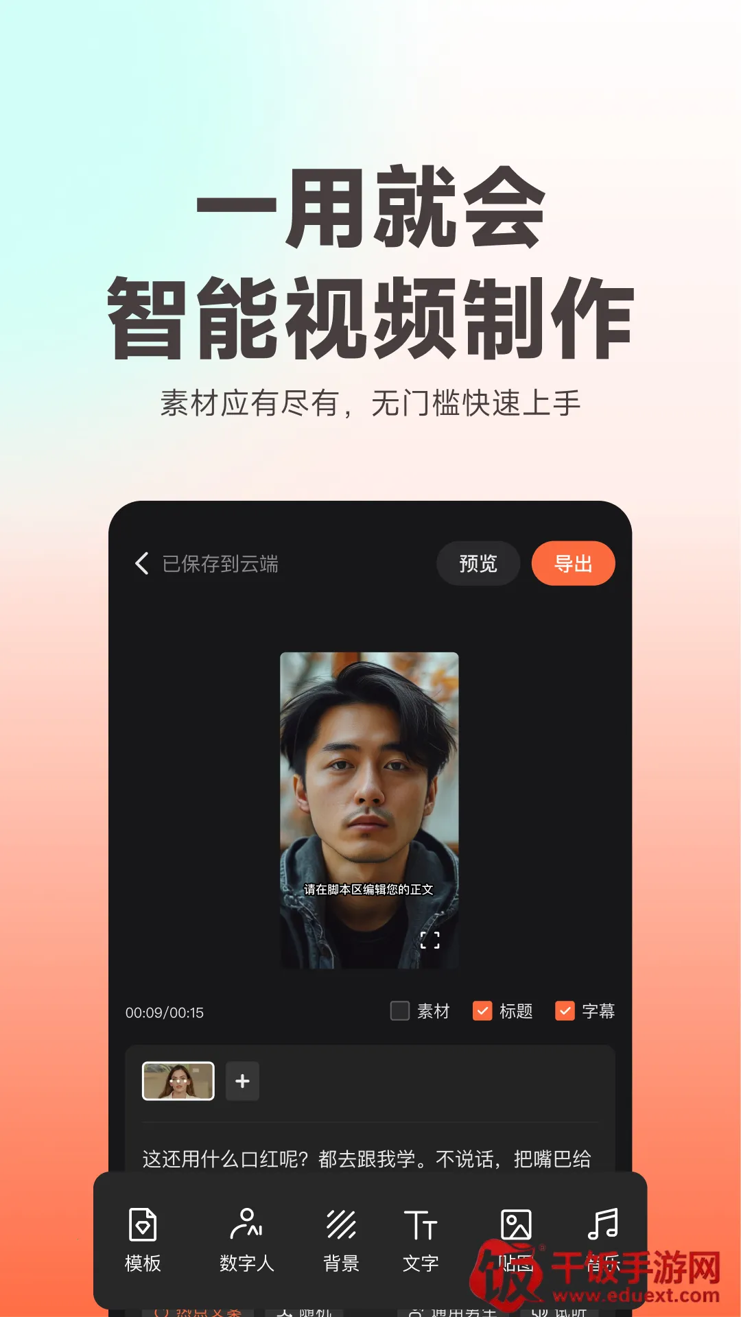 AI自动转化口播视频:输入文字内容,AI会自动将其转化为口播视频,省去拍摄录制剪辑等繁琐流程,大幅压缩制作时间,哪怕零剪辑基础也能快速出片。