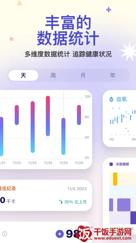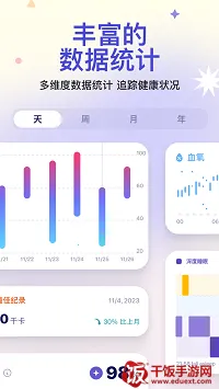 2、健康追踪全:可自动追踪睡眠、锻炼、压力、HRV、经期、喝水等十余种健康数据,还提供专业数据分析,助用户全面了解自身身体状况。