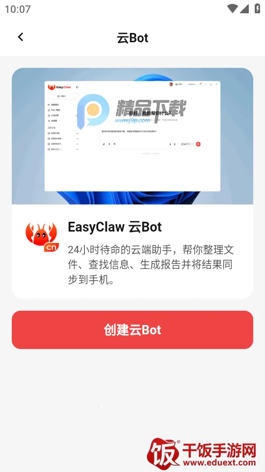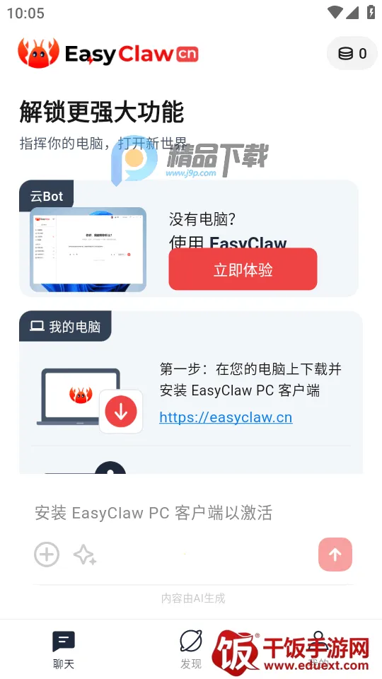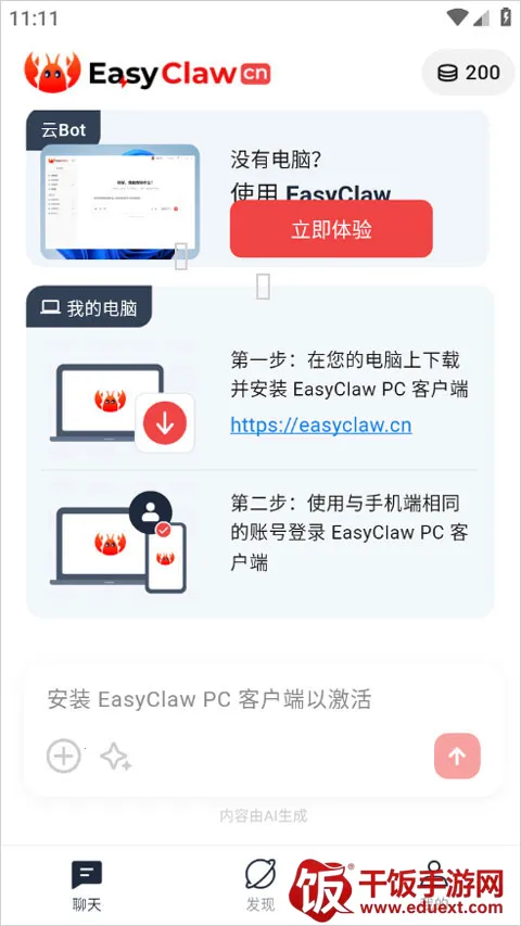 2、登录以后,我们可以按照提示,在自己的电脑设备上安装EasyClaw PC客户端,然后登录与手机版同一个账号,即可实现远程下达指令;
