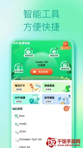 4. 功能多样:不仅可免费连接WiFi,还能进行防蹭网、测网速、网络诊断等,是家庭路由器的好帮手。