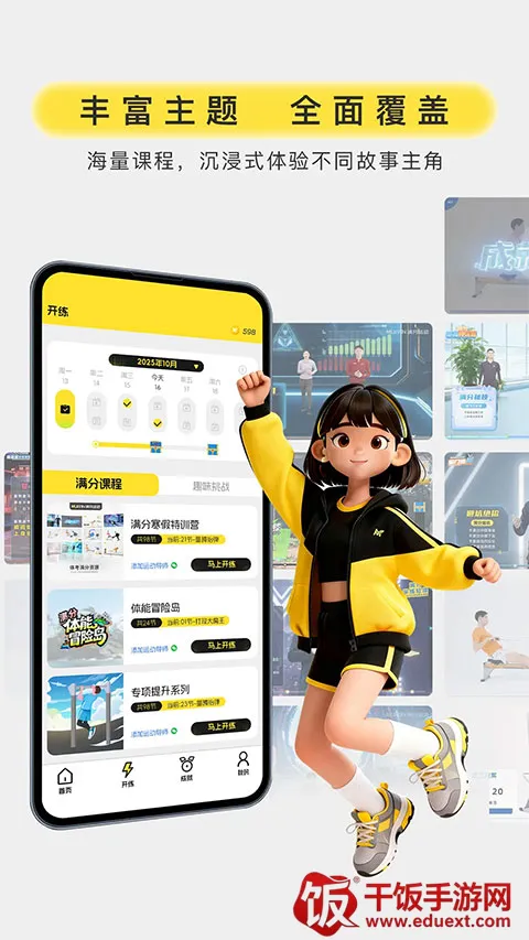 3. 多场景覆盖与硬件联动:课程覆盖体能提升、体考专项、趣味互动三大核心场景,还拓展至家庭场景,支持智能跳绳、划船机等硬件联动。
