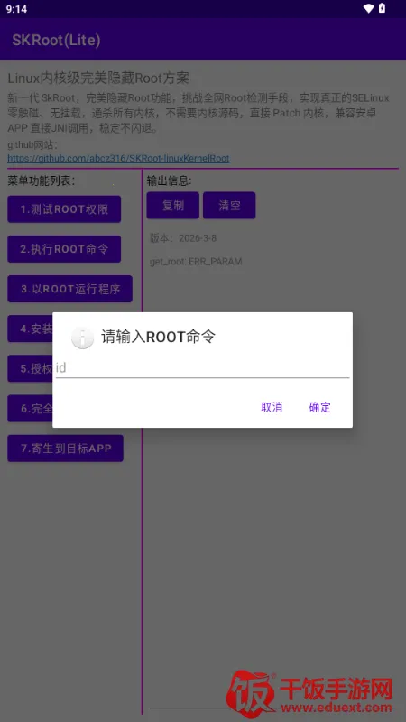 3.安装并启动或者,输入Root密匙值,即可正常使用SKRoot。skroot_lite.apktestRoot