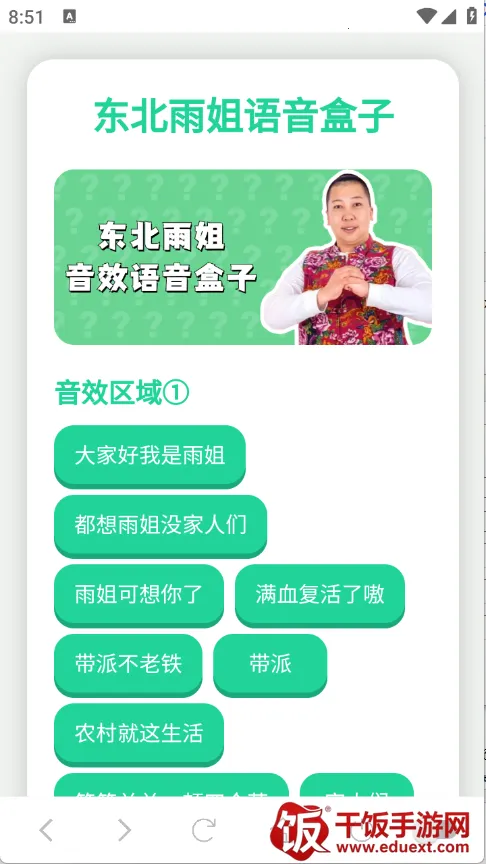 东北雨姐语音盒超好用!它里面有网上很火的语音包,而且所有语音包免费,能收藏分享和下载。支持单击播放、循环播放以及随机播放,使用起来超方便。这些语音包可用于社交聊天,能大大增加聊天氛围。不管是和朋友唠嗑,还是在群里交流,发个有趣的语音包,瞬间就能让对话变得更有意思。再也不用担心聊天时词穷或者气氛尴尬啦,轻松就能让交流充满乐趣。有了东北雨姐语音盒,就像给聊天装上了欢乐引擎,随时随地都能为你的社交互动增添别样色彩,赶紧来试试吧,让你的聊天从此与众不同!