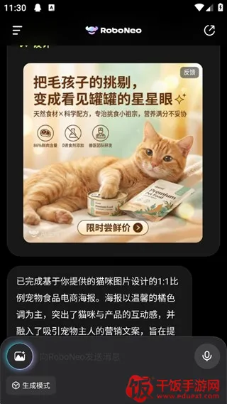 2、向RoboNeo提出你的编辑需求,比如以下图为例,要求根据图片生成一张1:1的海报。