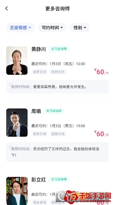 1. 专业权威:拥有经验丰富且经过严格筛选培训的心理咨询师团队,具备专业资质,能提供高质量咨询服务,为用户解决各种心理问题。